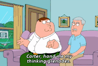 Carter, hand me my thinking grenades. Where did you get these? (SHUSHING) Carter, I'm thinking. - (EXPLOSION) - Uh-huh. MAN: Oh, my God! He's dead! That might work. What's happening? I got it!