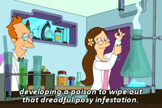 developing a poison to wipe out that dreadful posy infestation. I thought our love would last forever. But then, 43 years later, she left me for a robot! (SOBBING)