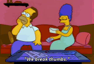 "We break thumbs." Homer, what are we going to do? I don't know. I don't know. Repo man. I'm here for the baby's things. Crib, mobile, monitor... and the lady's ring, I'm afraid.