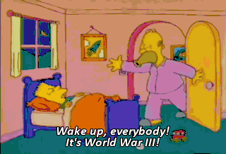 Wake up, everybody! It's World War III! Quick! Down to the fallout shelter! The bombs are dropping!