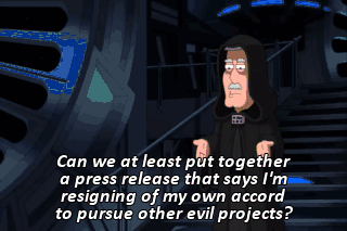 Can we at least put together a press release that says I'm resigning of my own accord to pursue other evil projects?