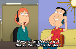 Now, what else you got there? You got a stapler? Uh-huh. Yeah. Okay, why don't you go ahead and stick that in your mouth, too.