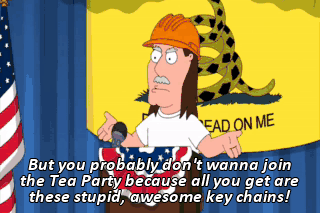 But you probably don't wanna join the Tea Party because all you get are these stupid, awesome key chains! (CROWD CHEERING) Oh, my God, it's the keychain from the dream!