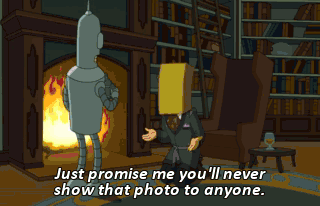 Just promise me you'll never show that photo to anyone. I swear on my honor as a paparazzo. Hey, Fry, want to see a picture? Sure. Hmm... He looked at the photo and that happened.