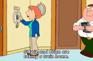Stewie and Brian are taking a train home. Jeez, Can we not talk about curtains for 2 seconds? I got another one of those relationship tapes.