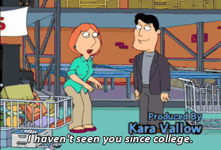 I haven't seen you since college. How are you? Great, great. Wow, Lois! You haven't aged a bit. Oh, Thank you. uh, This 12-pack of fungicide is for my daughter, Meg. Ahem. Help me.