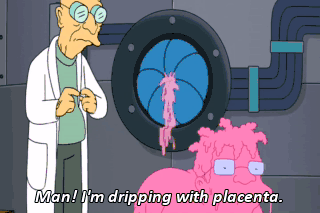 Man! I'm dripping with placenta. Good thing it's Casual Friday. Amy Wong! Ooh! Baby soft. Indeed.