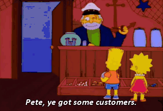 Pete, ye got some customers. No, we're looking for this man-- Krusty the Clown. Hmm. N'arr, n'arr, n'arr. It's hopeless, Bart. We've searched up and down these docks,
