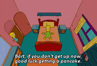Bart, if you don't get up now, good luck getting a pancake. Dad's pulled his chair right up to the stove. Lise, I think I'm having a midlife crisis.