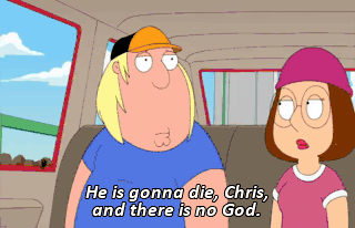 He is gonna die, Chris, and there is no God. Meg, stop being truthful with your brother.