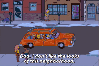 Dad, I don't like the looks of this neighborhood. It's fine. Now, everyone just relax, lock your doors, don't make eye contact with anyone, and listen to the radio.