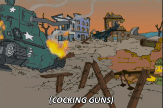 (COCKING GUNS) Something's coming, Sarge. Something big! Stay strong, men. The United States is due to win a war sometime. Oh, good Lord! It a Swingline!
