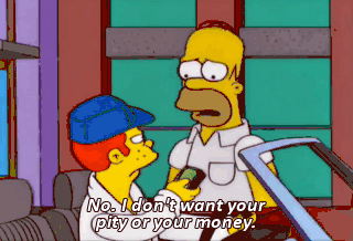 No. I don't want your pity or your money. Usually when you say that, you give the money back. I do what now? Yoink!