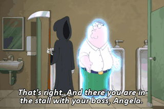 That's right. And there you are in the stall with your boss, Angela.