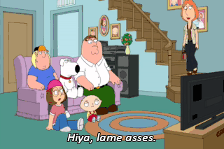 Hiya, lame asses. (ALL EXCLAIMING DISAPPROVAL) We were having a nice time. Sorry. I'm just painfully aware that I'm the only member of this family who's going out for drinks with a celebrity tonight.
