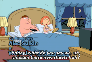 Honey, what do you say we, uh, christen these new sheets huh? Why, Lois Griffin, you naughty girl. That's me. You dirty hustler. You filthy, stinky prostitute.