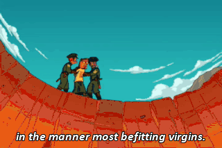 in the manner most befitting virgins. Whoa! He's dead, Jim. He's dead, Jim. He's dead, Jim. Finally, the sacred texts were banned.