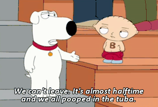 We can't leave. It's almost halftime and we all pooped in the tuba. (MARCHING BAND PLAYING) (TUBA PLAYER EXCLAIMING) Okay, we can go.
