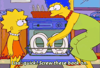Lisa, quick! Screw these back on. Mom, calm down. The party's not for another three hours. Oh, good. That will give me time to add another coat of glaze to the ham.