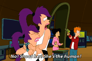 No! Shoot her! She's the human! But how do I know who's the human and who's the robot? We just told you! Yeah, you idiot! Okay. Fine. If you're going to be like that, I'm not shooting anyone.