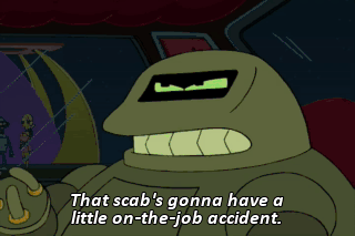 That scab's gonna have a little on-the-job accident. With all due respect, Donbot, I don't think we should rely on an accident happenin'. Let's kill him ourselves.