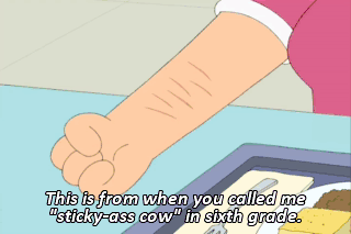 This is from when you called me "sticky-ass cow" in sixth grade. This one is from when you made a plaster cast of my vagina freshman year. You want my help? You can go fuck yourself!