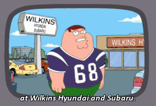 at Wilkins Hyundai and Subaru. We will blitz the competition, and in no time, you 'll be driving your new Hyundai or Subaru right to a touchdown. (PETER SINGING JINGLE)