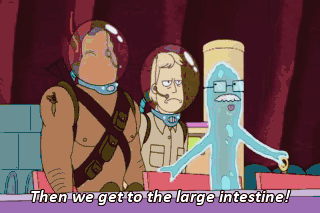 Then we get to the large intestine! Shh! I hear something. Don't move. Gonorrhea can't see us if we don't move. Wait, I was wrong, I was thinking of a T, Rex.