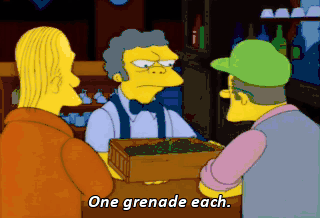 One grenade each. Moe, I think he meant through nonviolent grassroots political action. Ah, geez. Really? You think so? All right, give 'em back! Everybody, give 'em back.