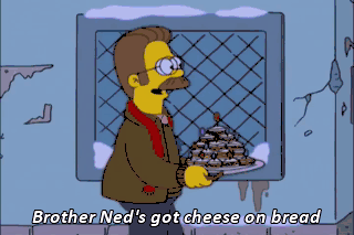 Brother Ned's got cheese on bread and a side order of shame. Bells... Where the H-E-C-K is everybody? Here's your skates. Oh, you'll have to take off those boots. Those are my feet.