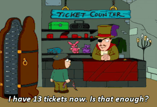 I have 13 tickets now. Is that enough? Oh, Sorry, Timmy. But you need 15 tickets to live. They also get food, cake,