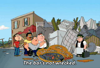 The bar's not wrecked. All right! Oh, thank you, God. Don't mention it.