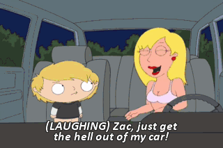 (LAUGHING) Zac, just get the hell out of my car! That's it? That was sex? What a rip-off. I should sue her. Be careful you're not held in contempt of cat! Ha!