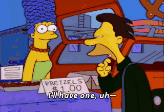 I'll have one, uh-- Hey, hurry up. I wanna get my pretzel. - One pretzel. - Thank you. Let's see, uh, I will have one of your, uh-- Come on, come on. While we're young.