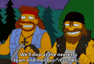We'll stop at the nearest town and mail our "rÉsumes." "RÉsumes." It still sounds weird to me.