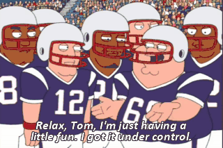 Relax, Tom, I'm just having a little fun. I got it under control. Okay, 28-2 right, pitch left, on one, on one. Ready? Break! Ready, green 54! Green 54! Set, hut, hut!