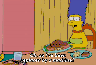 Oh, so I've been replaced by a machine? (CHUCKLES) Marge, no machine could ever replace you. Why, you're the... Or could it? Oh, Margebot, I'm ready for some loving.