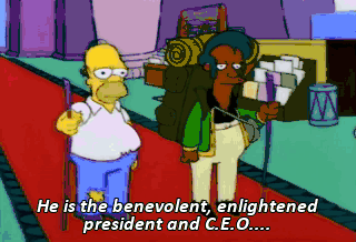 He is the benevolent, enlightened president and C.E.O.... of Kwik-E-Mart, and in Ohio, Stop-O-Mart. He is the one I must ask for my job back. Approach, my sons. You may ask me three questions.