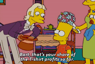 Bart, that's your share of the T-shirt profits so far. ALL: Ooh. Look at all that cash! And now it's time for me to leave! What a delightful sprite!