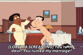 (LORETTA SCREAMING) You're the devil! You ruined my marriage! You can't resist the Q-man and my super-powered genitalia. Apache Penis, ee-nay-chok!