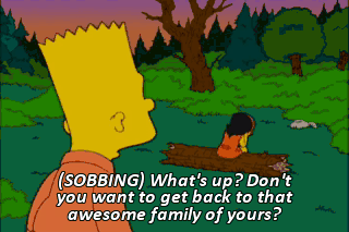 (SOBBING) What's up? Don't you want to get back to that awesome family of yours? What are you crying about? How cool they are? Oh. I know you're sad now.