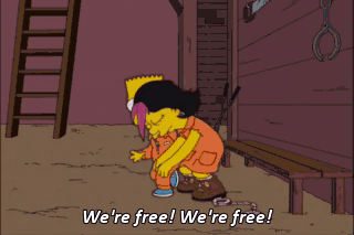 We're free! We're free! Bart, I'm gonna miss you so much. Hey, the next time my mom asks me to help around the house, I could come live with your family. (GRUNTS) Don't get fresh with me, jerk!
