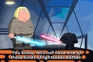 You know, let's not have one of those kinds of lightsaber battles. Car. Car coming!