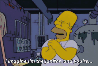 I imagine I'm the janitor, and you're... the janitor's wife, who has to live with me in the utility room. Don't mind me, folks. just need to get the ol' wet-dry vac.