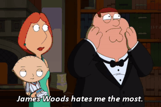 James Woods hates me the most. That means he's probably gonna kill me next. (IN SOUTHERN VOICE) Well, I reckon if I was a cattle-rustler, I wouldn't be afeared. Oh, Peter, that's good. I know, Lois.