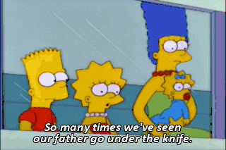 So many times we've seen our father go under the knife. One more and I get a free hysterectomy. Now, Homer, you'll have a full recovery from your spinal cord injury.