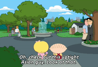 Oh, check out this uptight Asian guy. Look at that. (SINGSONGING TO ASIAN MELODY) "I work really hard, 'cause I'm no fun."