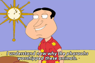 I understand now why the pharaohs worshipped these animals. (RIPPING) Oh, look, Joe. He's making friends. Oh, sorry. You know what? It's all right, Quagmire. That leg is mostly pus. Okay. Here it comes, James.