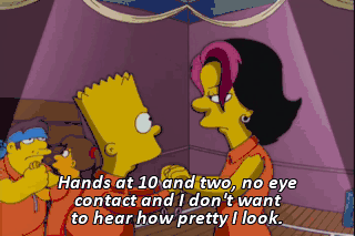 Hands at 10 and two, no eye contact and I don't want to hear how pretty I look. Don't worry. You won't. D'oh! (GRUNTING)