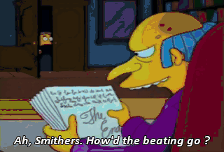 Ah, Smithers. How'd the beating go ? Sir, I-- There was no beating. What ? - That's a hell of a thing. Why ? - Because I-- I called it off. judas !